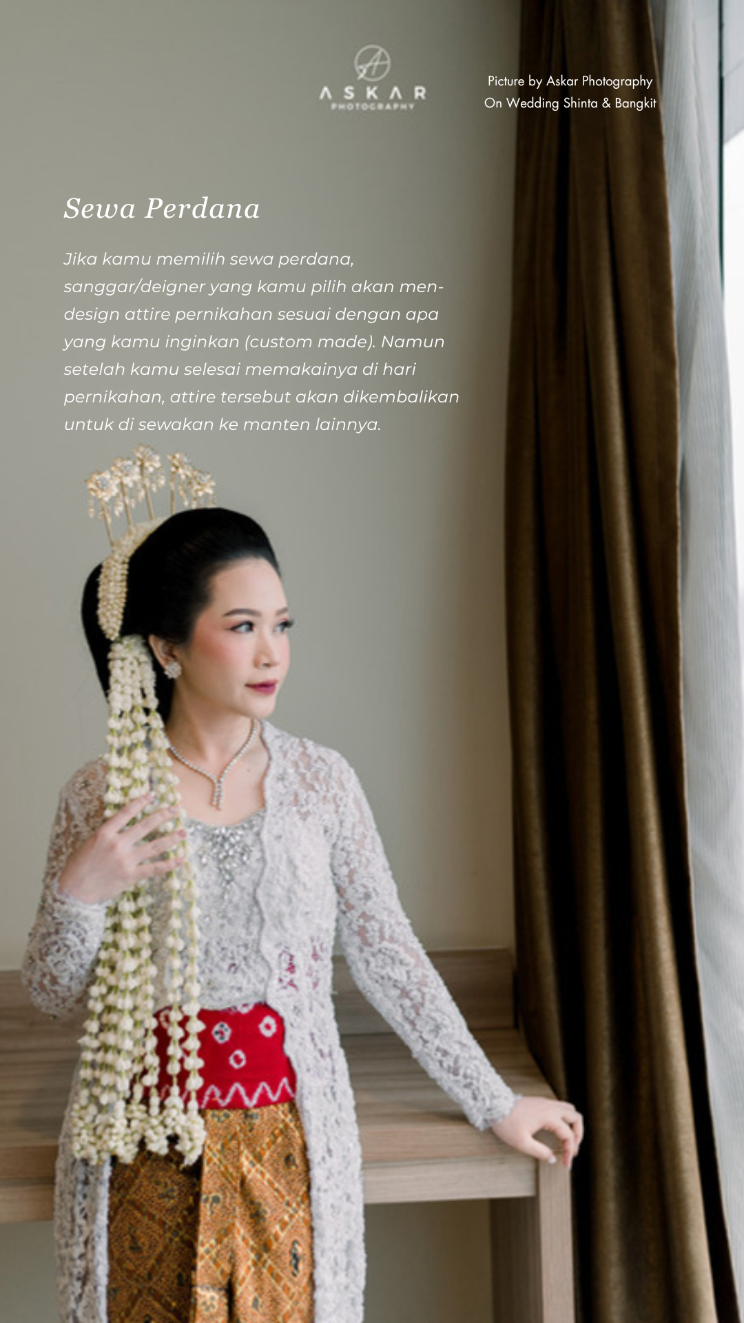 Jika kamu memilih sewa perdana, sanggar/deigner yang kamu pilih akan men-design attire pernikahan sesuai dengan apa yang kamu inginkan (custom made). Namun setelah kamu selesai memakainya di hari pernikahan, attire tersebut akan dikembalikan untuk di sewakan ke manten lainnya.