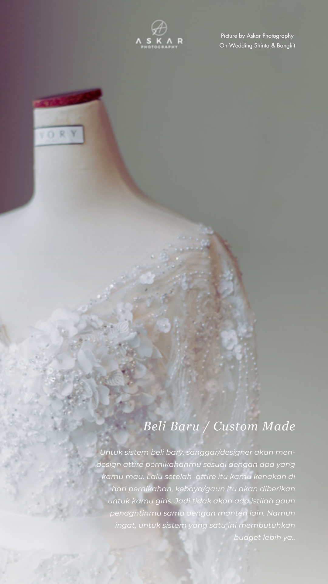 Untuk sistem beli baru, sanggar/designer akan men-design attire pernikahanmu sesuai dengan apa yang kamu mau. Lalu setelah attire itu kamu kenakan di hari pernikahan, kebaya/gaun itu akan diberikan untuk kamu girls. Jadi tidak akan ada istilah gaun penagntinmu sama dengan manten lain. Namun ingat, untuk sistem yang satu ini membutuhkan budget lebih ya.