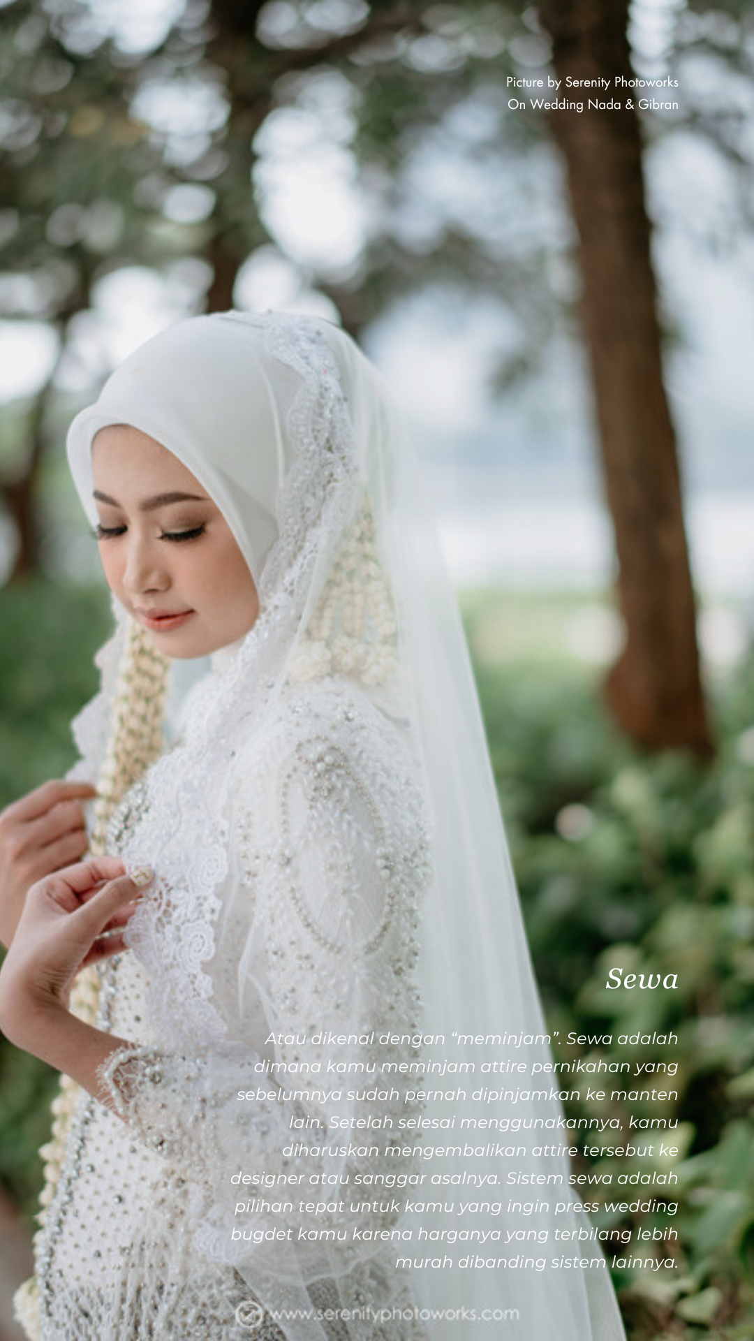 Sewa atau dikenal dengan “meminjam”. Sewa adalah dimana kamu meminjam attire pernikahan yang sebelumnya sudah pernah dipinjamkan ke manten lain. Setelah selesai menggunakannya, kamu diharuskan mengembalikan attire tersebut ke designer atau sanggar asalnya. Sistem sewa adalah pilihan tepat untuk kamu yang ingin press wedding bugdet kamu karena harganya yang terbilang lebih murah dibanding sistem lainnya.